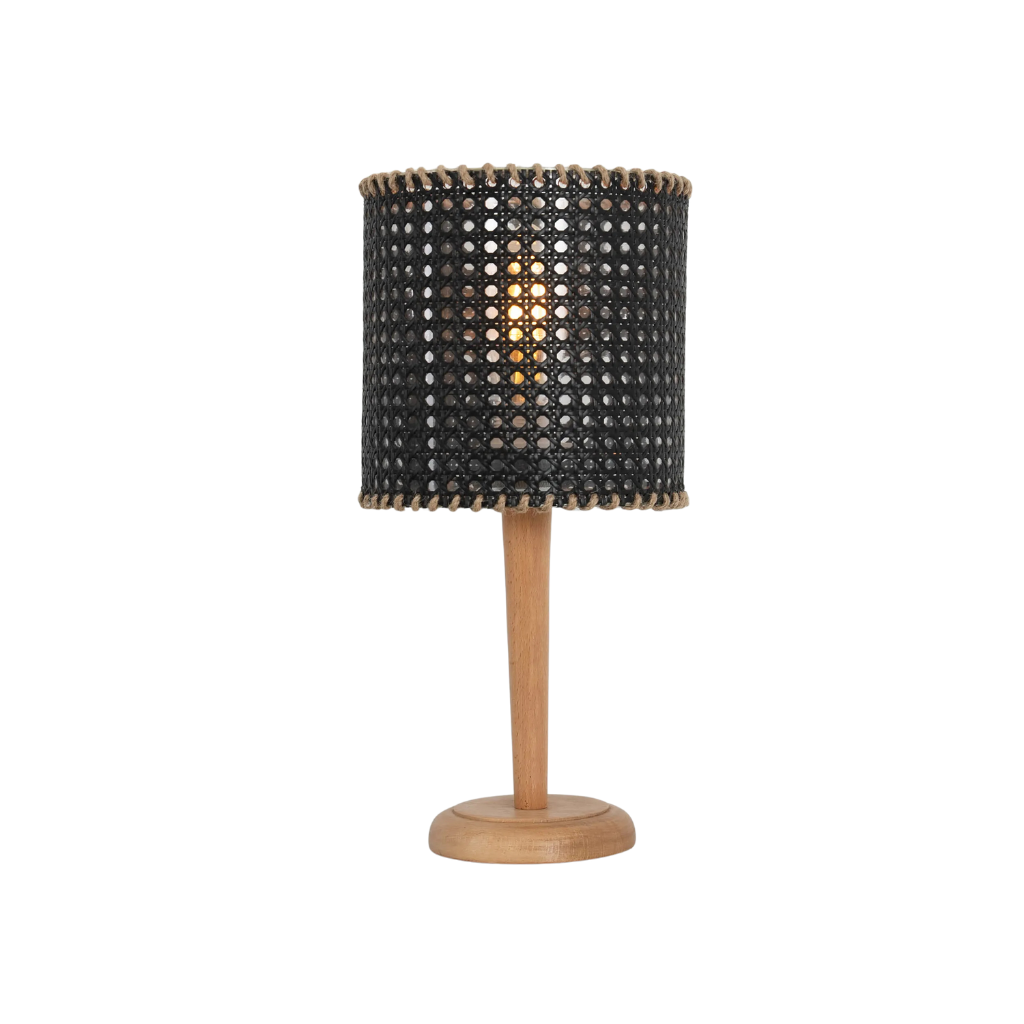- Cylindrical lampshade with a striking black woven cane finish