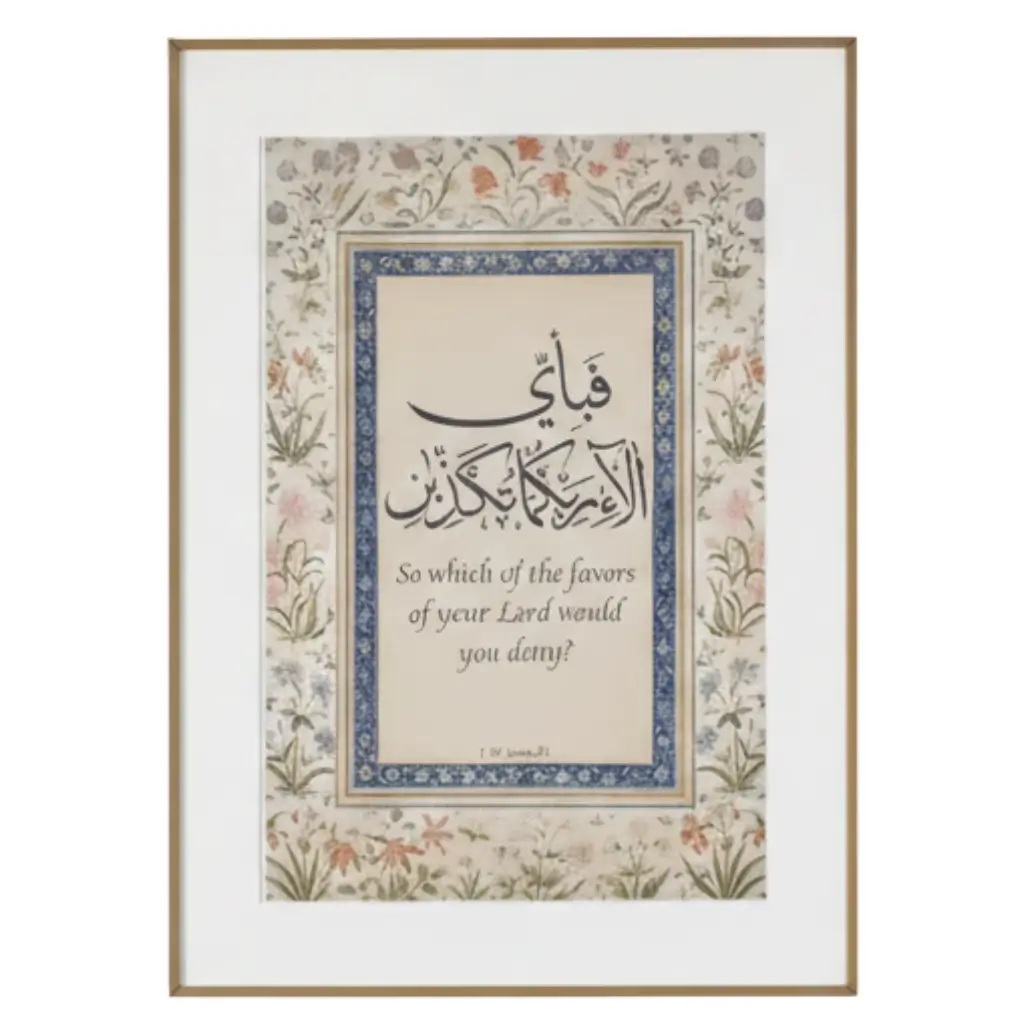 Presented in elegant Arabic calligraphy and framed within a manuscript-inspired illuminated border, this piece invites reflection, gratitude, and appreciation of divine blessings.