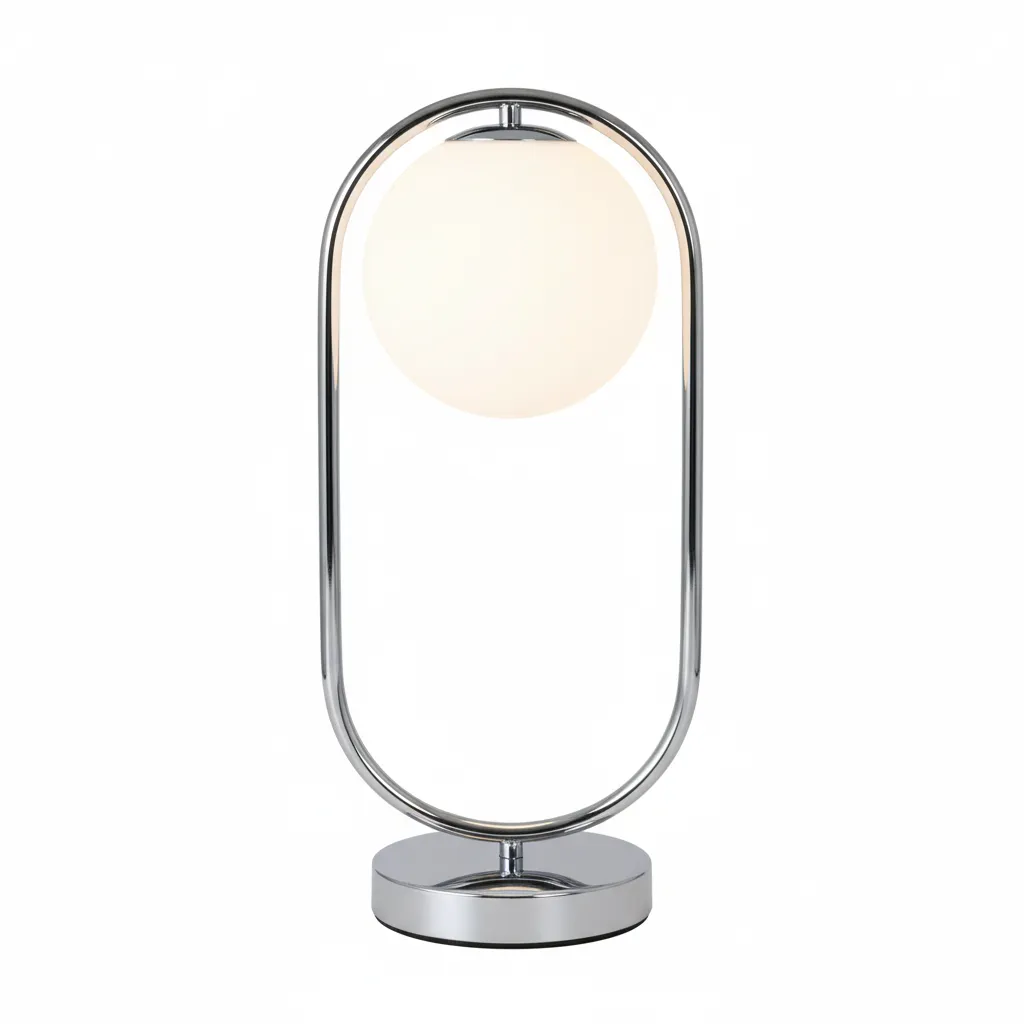 A table lamp with a polished silver steel frame and a soft opal glass globe, combining modern style with warm lighting. The steel body features a silver Korean electrostatic finish, while the opal glass globe diffuses light gently. It includes one E27 socket (bulb not included) and is ideal for desks, shelves, or bedside tables.