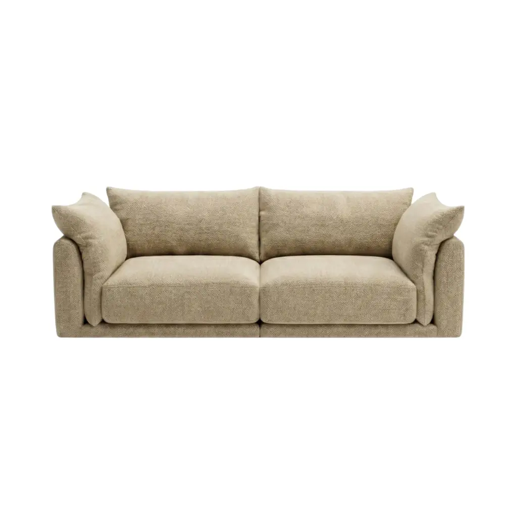 - Soft fabric complements contemporary and minimalist interiors, while generously sized back and side cushions extend down to the seat level, creating a visually rich and inviting silhouette.