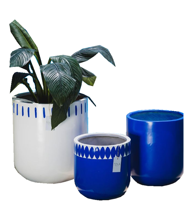 The Santorini Set is a stunning addition to any outdoor space. Crafted from durable fiberglass and hand-painted by the talented artisans of Tova Designs, this set features three unique pieces with deep blue hues reminiscent of the ocean. The perfect way to bring a touch of Mediterranean charm into your garden, each pot is sold separately or in sets for added convenience and features classic white accents that highlight the beauty of Santorini architecture. With its vibrant colors and timeless design, this planter pot set will make an elegant statement in any outdoor setting while evoking memories of summer days spent by the sea.