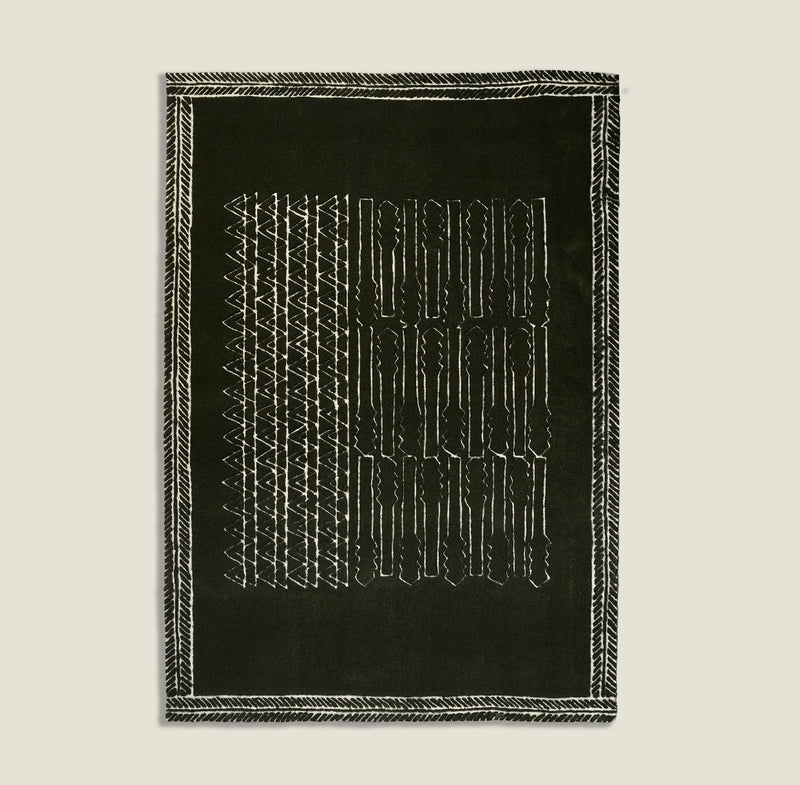 A black rug made of wool and viscose, featuring white line art along the edges and in the center for a refined visual contrast. Carpet clean is recommended; avoid using bleach, stain remover, or tumble dry. Designed for indoor use, its minimal yet artistic design adds depth and sophistication to modern living rooms, bedrooms, and elegant interiors.