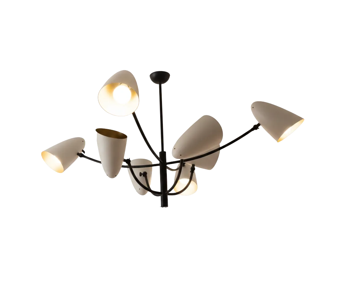 A chandelier crafted from sleek metal rods, featuring 7 white cone-shaped lampshades for a balanced and modern look. Its clean design and refined form make it a versatile centerpiece, ideal for enhancing contemporary interiors with elegance and style.