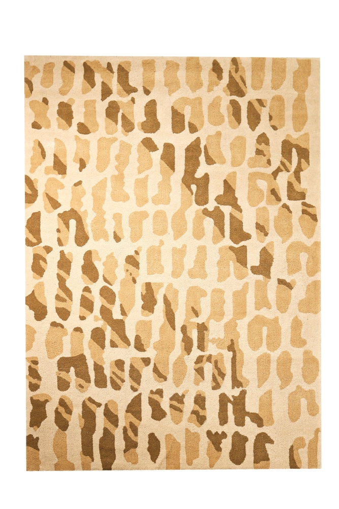 A tufted rug with an abstract design subtly inspired by animal prints in warm neutral shades of beige, tan, and brown. Its dynamic pattern creates movement and visual depth, while the high-quality wool and silk blend offers a soft, luxurious texture. Perfect for adding modern elegance and character to any living space.