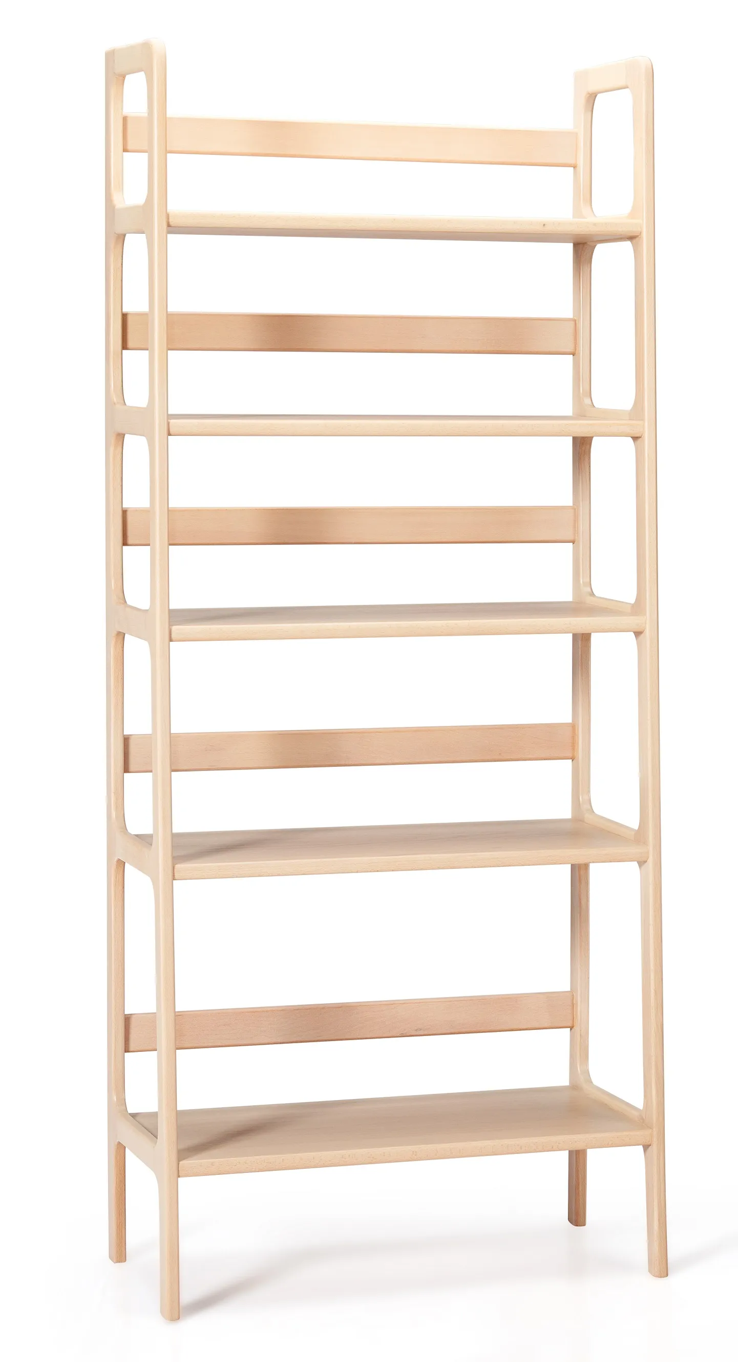 A versatile wooden shelving unit suitable for living rooms, kitchens, bedrooms, and even bathrooms. featuring a simple design with five levels of open shelves, it offers functional storage with a clean aesthetic. place two units side by side for a trendy, cohesive look that provides the appearance of one large unit and maximizes storage space.