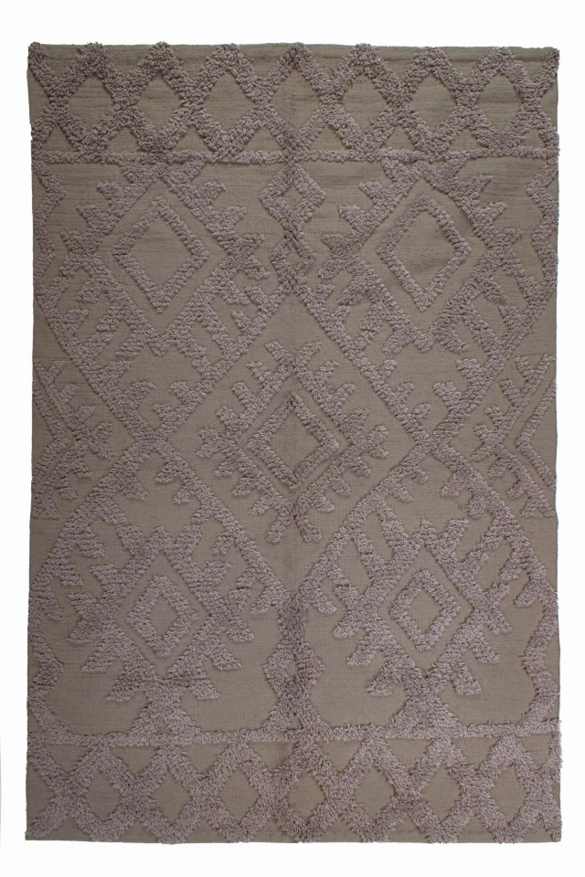 A wool handmade kilim rug featuring a captivating geometric design in elegant greige tones. Crafted using a textured, looped weaving technique, it adds depth and visual interest to any space. Its modern yet sophisticated look and neutral palette make it a versatile choice for various interior styles.