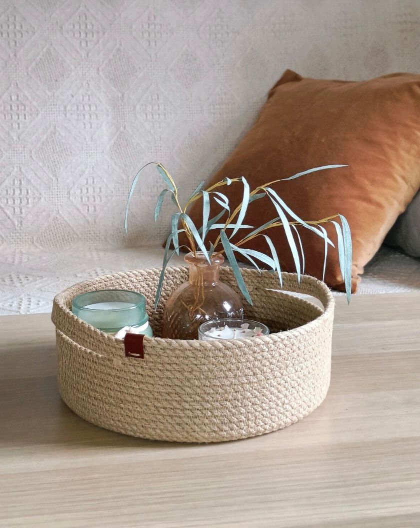 A woven decorative jute basket with two handles crafted with natural fibers, showcasing rustic beauty and artisanal charm. Its sturdy build makes it perfect for organizing essentials or simply serving as a stylish accent piece. Functional and versatile, it adds warmth and a natural touch to any room décor.